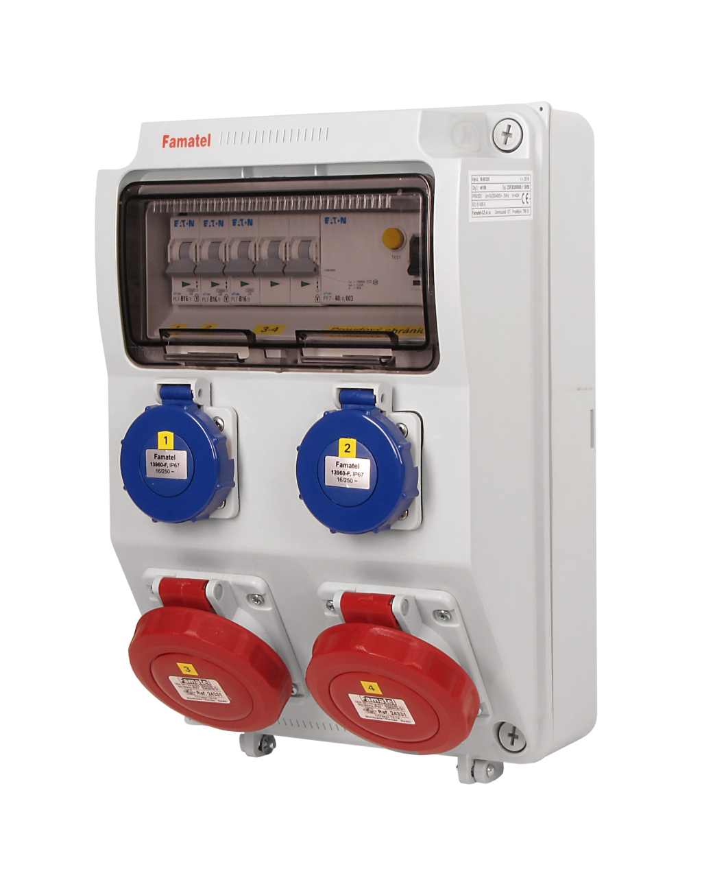 Zásuvková skříň FAMATEL v4106 - ZSF20200000.1 /3958 IP65 jištěná s chráničem 40/4/003, zásuvky 2x230V, 2x16/5, přístroje EATON 10kA: 2xPL7-B16/1, 1xPL7-B16/3, PF7- 40/4/003 na vstupu, použité pouzdro: 3958 - 330x215x155mm, barva: světle šedá.