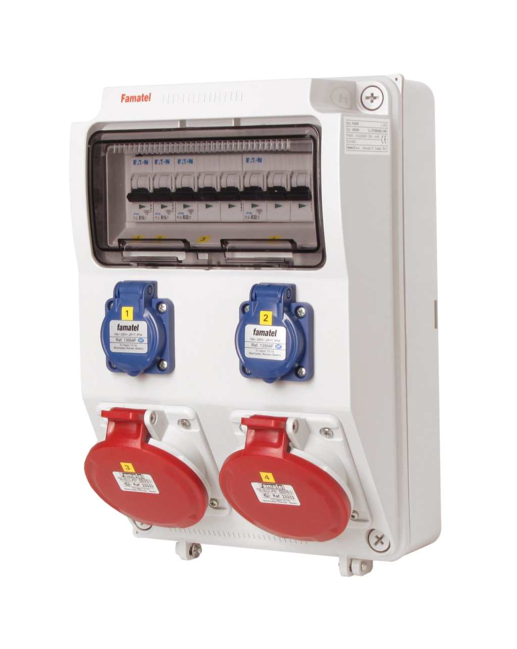 Zásuvková skříň FAMATEL v420-6kA-ZSF20002000.0 /3958 IP44 jištěná bez chrániče, zásuvky 2x230V, 2x32/5, přístroje EATON 6kA: 2xPL6-B16/1, 2xPL6-B32/3, použité pouzdro: 3958 - 330x215x155mm, barva: světle šedá.