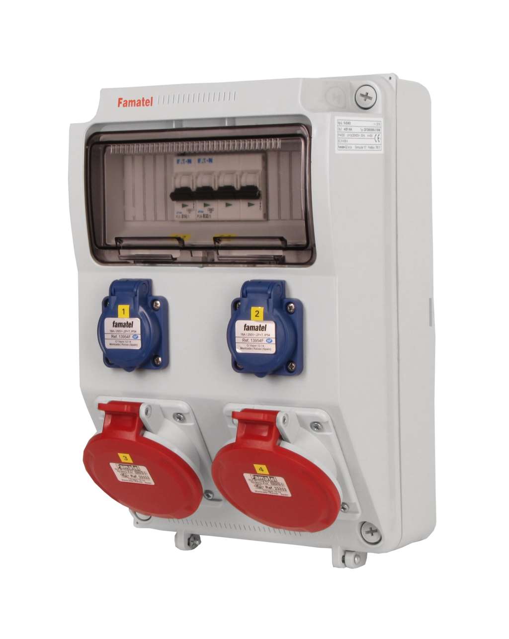 Zásuvková skříň FAMATEL v4201-6kA - ZSF20002000.0 /3958 IP44 jištěná bez chrániče, zásuvky 2x230V, 2x32/5, přístroje EATON 6kA: 1xPL6-B16/1, 1xPL6-B32/3, použité pouzdro: 3958 - 330x215x155mm, barva: světle šedá.