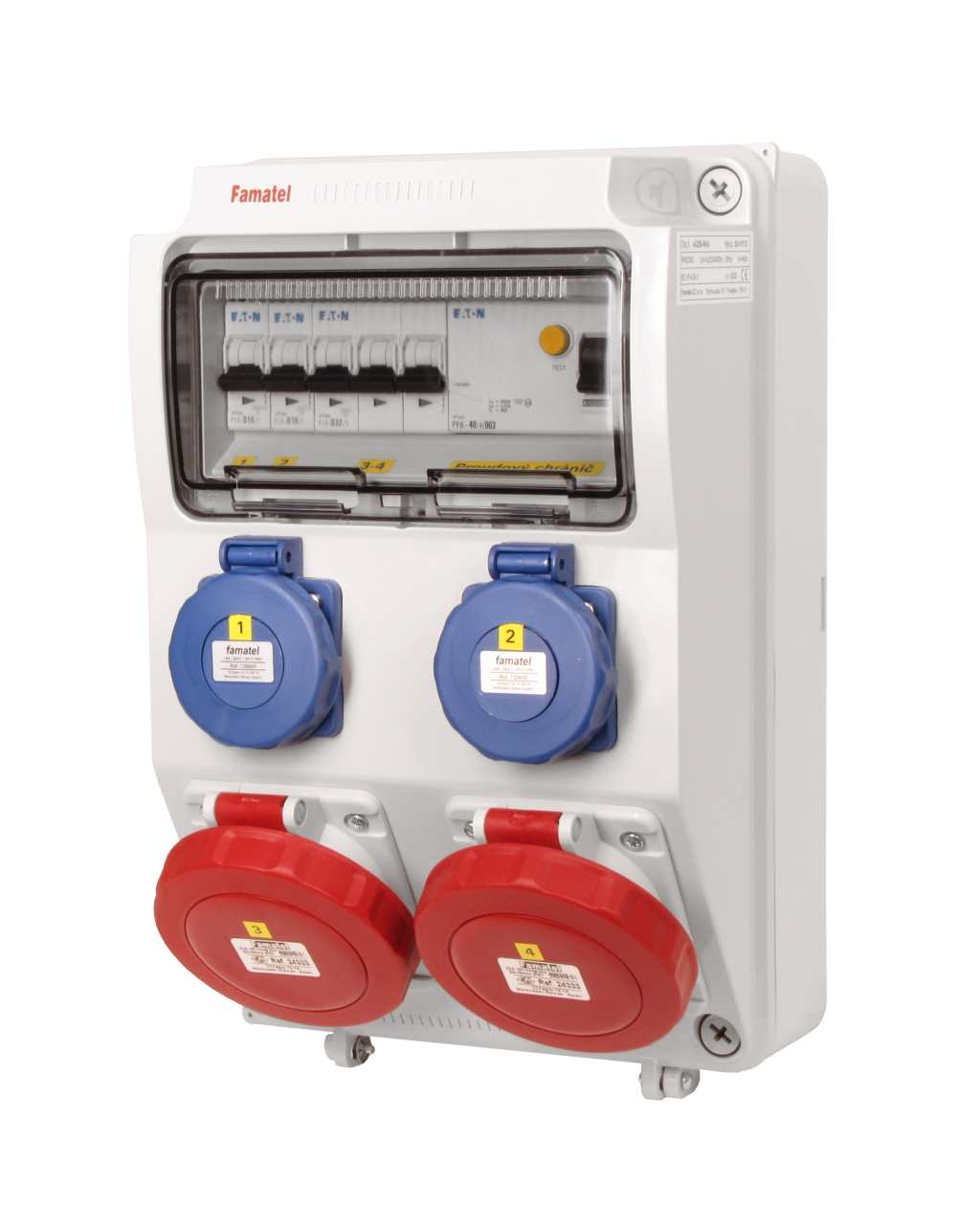Zásuvková skříň FAMATEL v4256-6kA - ZSF20002000.1 /3958 IP65 jištěná s chráničem 40/4/003, zásuvky 2x230V, 2x32/5, přístroje EATON 6kA: 2xPL6-B16/1, 1xPL6-B32/3, PF6- 40/4/003 na vstupu, použité pouzdro: 3958 - 330x215x155mm, barva: světle šedá.