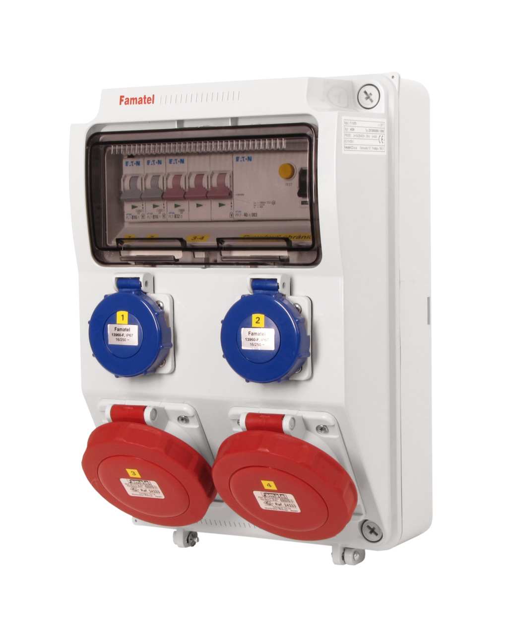 Zásuvková skříň FAMATEL v4256 - ZSF20002000.1 /3958 IP65 jištěná s chráničem 40/4/003, zásuvky 2x230V, 2x32/5, přístroje EATON 10kA: 2xPL7-B16/1, 1xPL7-B32/3, PF7- 40/4/003 na vstupu, použité pouzdro: 3958 - 330x215x155mm, barva: světle šedá.
