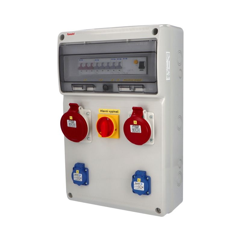 Zásuvková skříň FAMATEL v4402 - ZSFV20101000.1 /3952 IP44 jištěná s chráničem 40/4/003, zásuvky 2x230V, 1x16/5, 1x32/5, přístroje EATON 10kA: 2xPL7-B16/1, 1xPL7-B16/3, 1xPL7-B32/3, hl. vyp. 40A, HLAK 25mm2, PF7-40/4/003 na vstupu, použité pouzdro: 3952 - 500x330x155mm, barva: světle šedá.