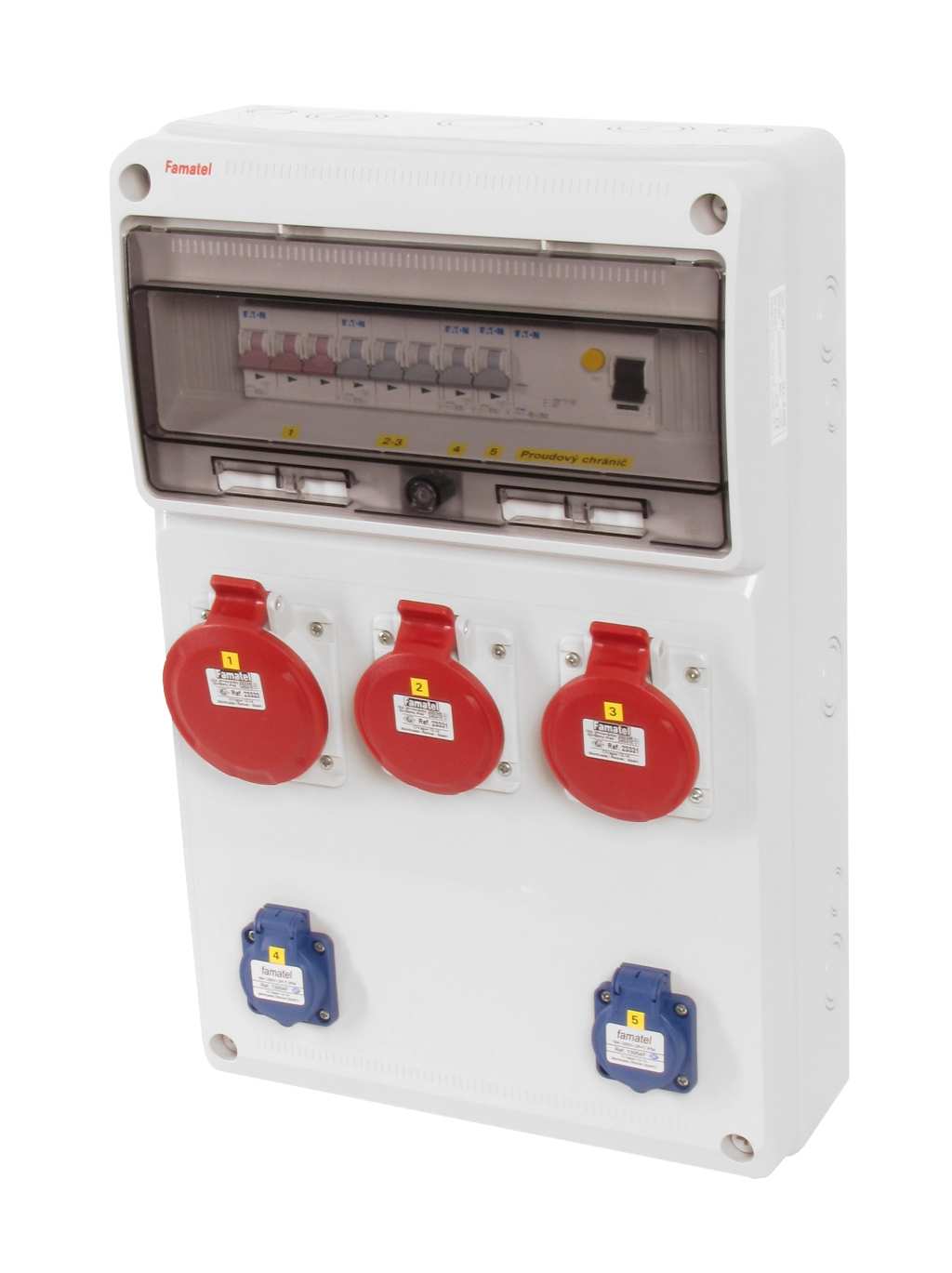 Zásuvková skříň FAMATEL v443 - ZSF20201000.1 /3952 IP44 jištěná s chráničem 40/4/003, zásuvky 2x230V, 2x16/5, 1x32/5, přístroje EATON 10kA: 2xPL7-B16/1, 1xPL7-B16/3, 1xPL7-B32/3, PF7-40/4/003 na vstupu, použité pouzdro: 3952 - 500x330x155mm, barva: světle šedá.