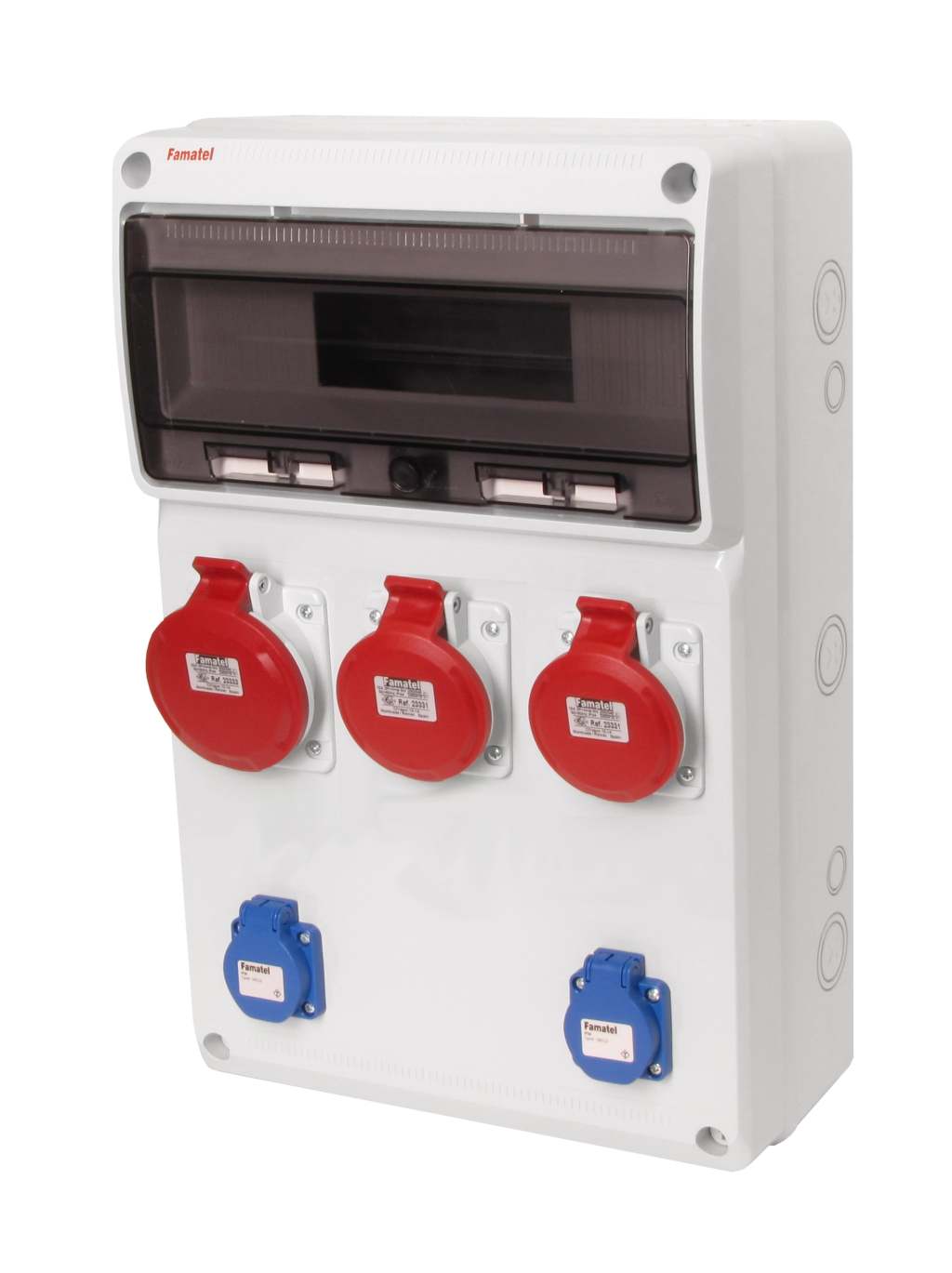 Zásuvková skříň FAMATEL v4433-6kA - ZSF20201000.0 /3952 IP44 jištěná bez chrániče, zásuvky 2x230V, 2x16/5, 1x32/5, přístroje EATON 6kA: 2xPL6-B16/1, 1xPL6-B16/3, 1xPL6-B32/3, použité pouzdro: 3952 - 500x330x155mm, barva: světle šedá.