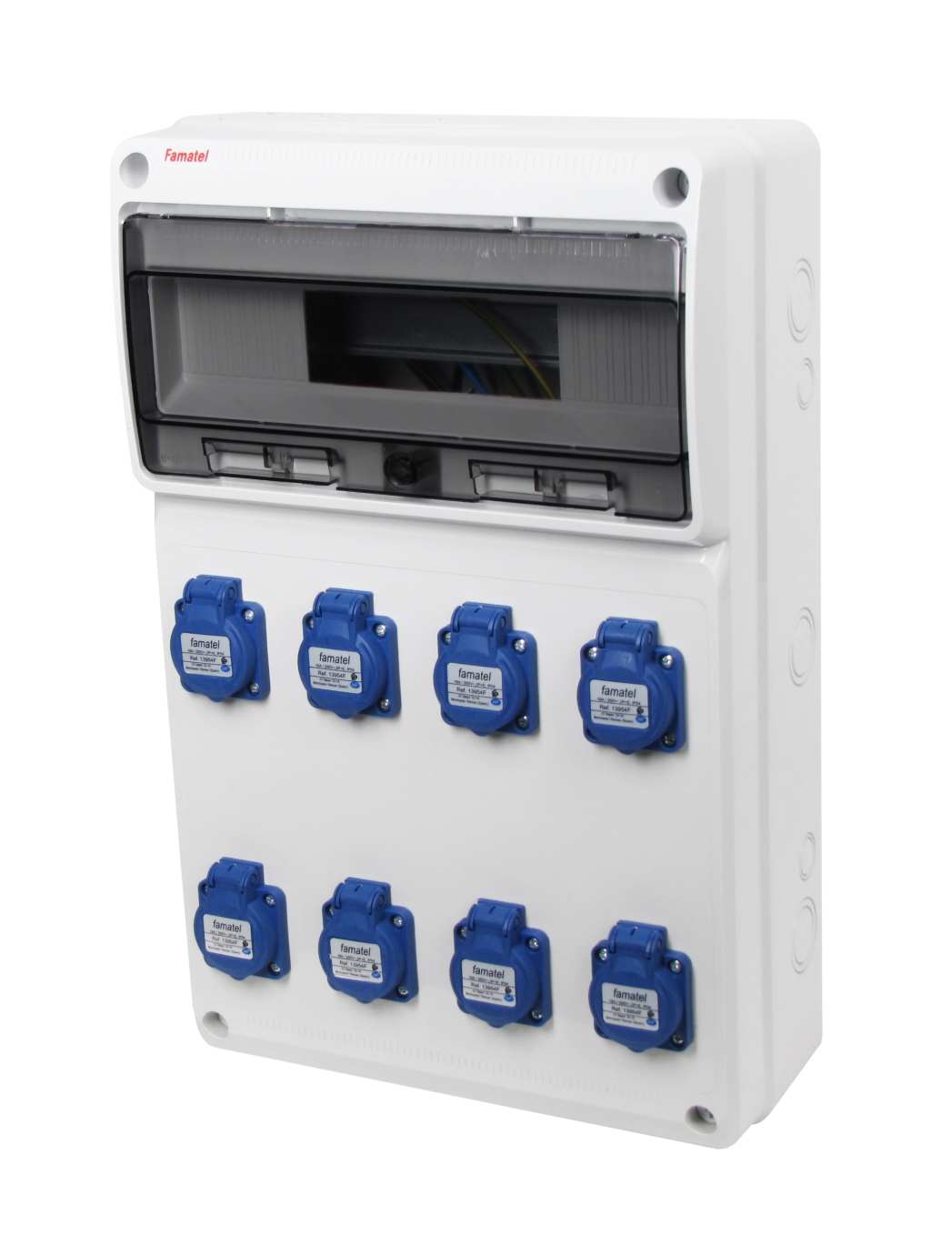 Zásuvková skříň FAMATEL v710 - ZSF80000000.V /3952 IP54 pouze vydrátovaná, zásuvky 8x230V, použité pouzdro: 3952 - 500x330x155mm, barva: světle šedá.