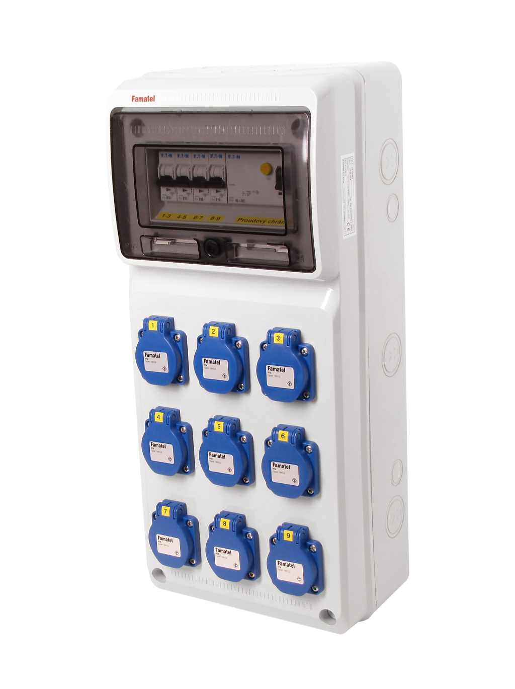 Zásuvková skříň FAMATEL v740-6kA - ZSF90000000.1 /3951 IP54 jištěná s chráničem 40/4/003, zásuvky 9x230V, přístroje EATON 6kA: 4xPL6-B16/1, použité pouzdro: 3951 - 500x230x155mm, barva: světle šedá.