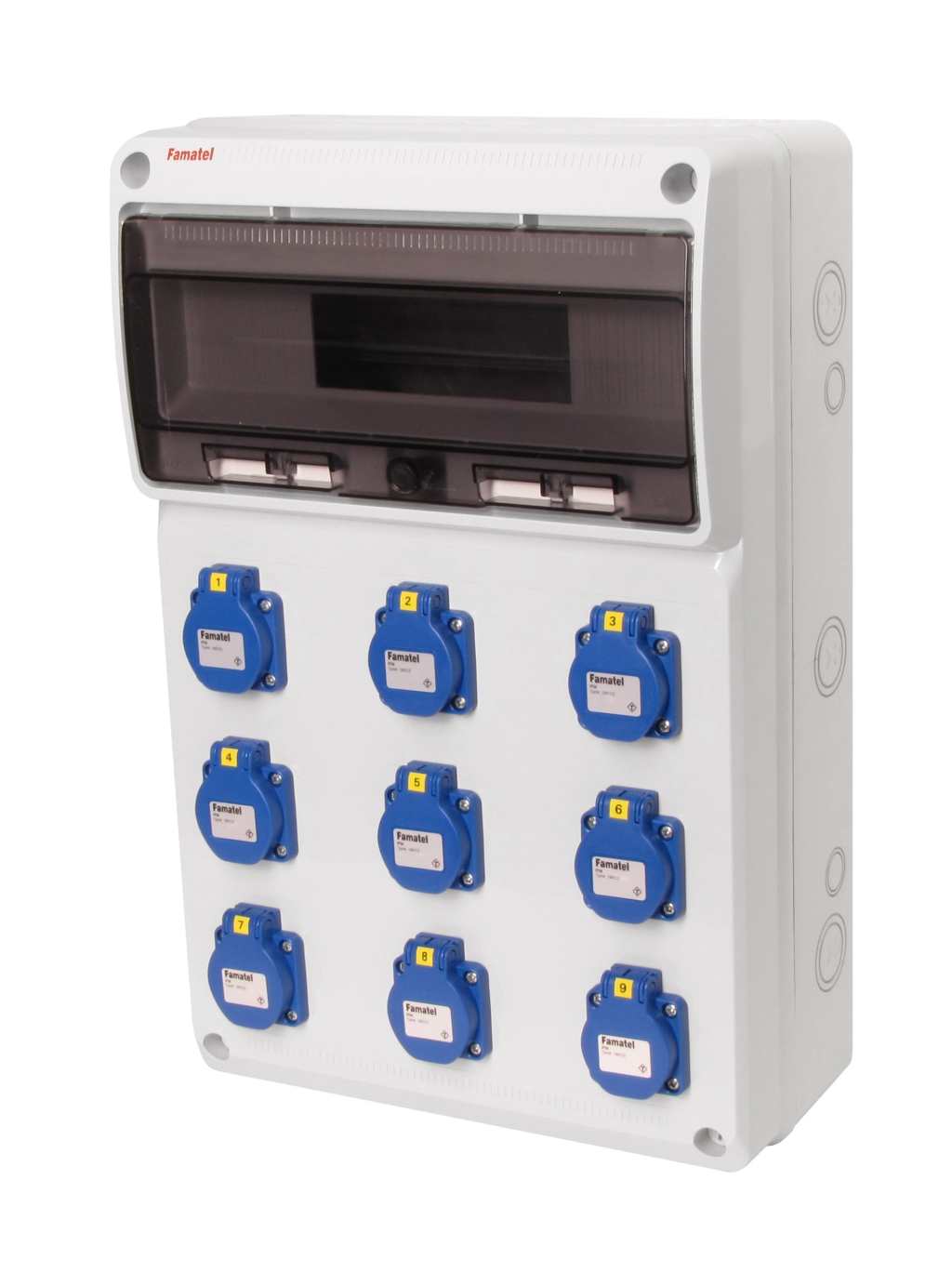 Zásuvková skříň FAMATEL v745 - ZSF90000000.V /3952 IP54 pouze vydrátovaná, zásuvky 9x230V, použité pouzdro: 3952 - 500x330x155mm, barva: světle šedá.