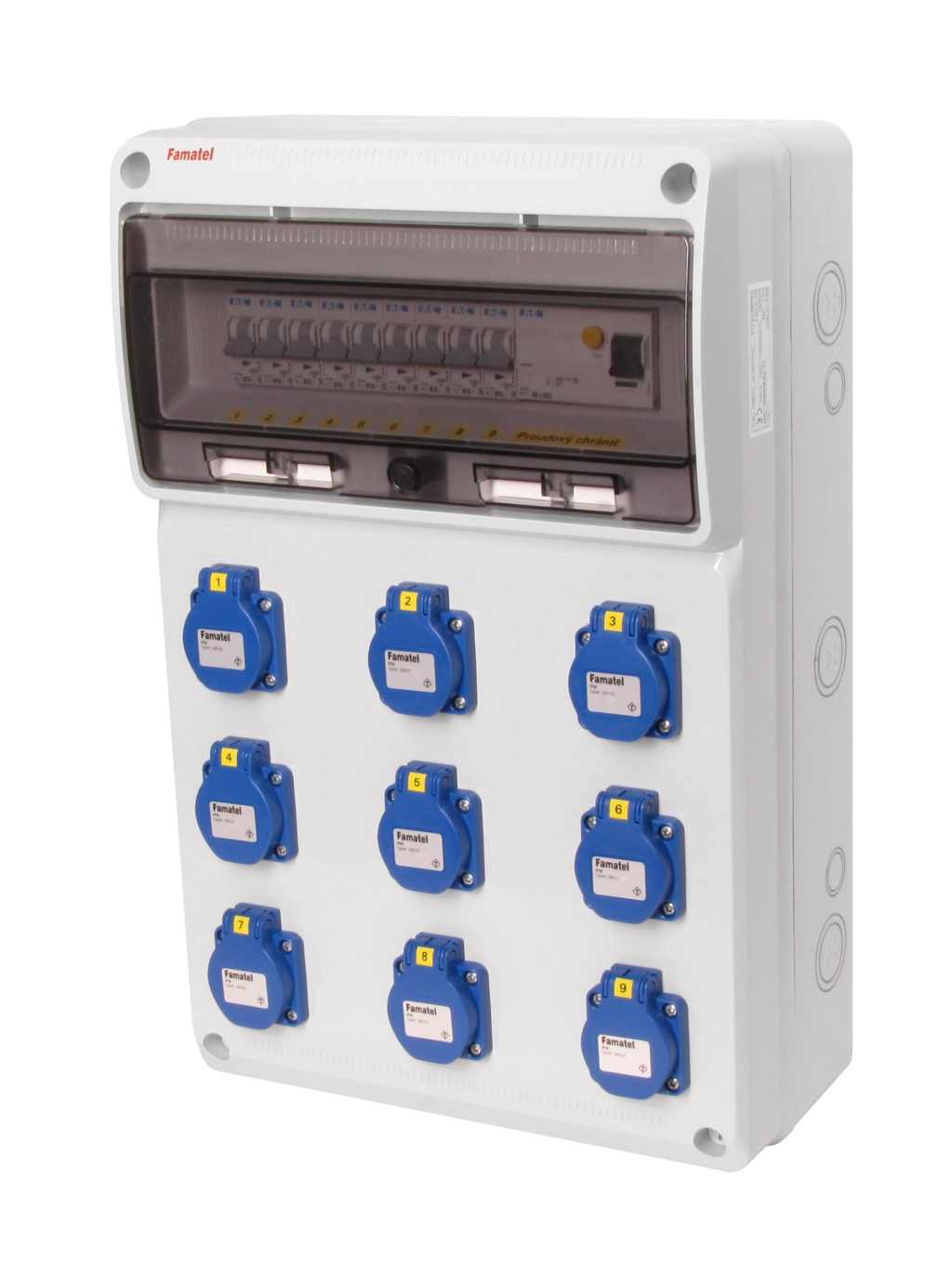 Zásuvková skříň FAMATEL v760-ZSF90000000.1 /3952 IP54 jištěná s chráničem 40/4/003, zásuvky 9x230V přístroje EATON 10kA: 9xPL7-B16/1, PF7-40/4/003, na vstupu, použité pouzdro: 3952 - 500x330x155mm, barva: světle šedá.