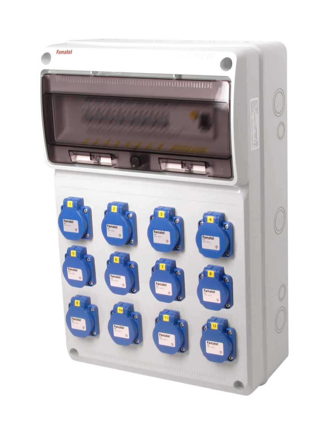 Zásuvková skříň FAMATEL v795 - ZSF120000000.1 /3952 IP54 jištěná s chráničem 40/4/003, zásuvky 12x230V, přístroje EATON 10kA: 9xPL7-B16/1, PF7-40/4/003 na vstupu, použité pouzdro: 3952 - 500x330x155mm, barva: světle šedá.