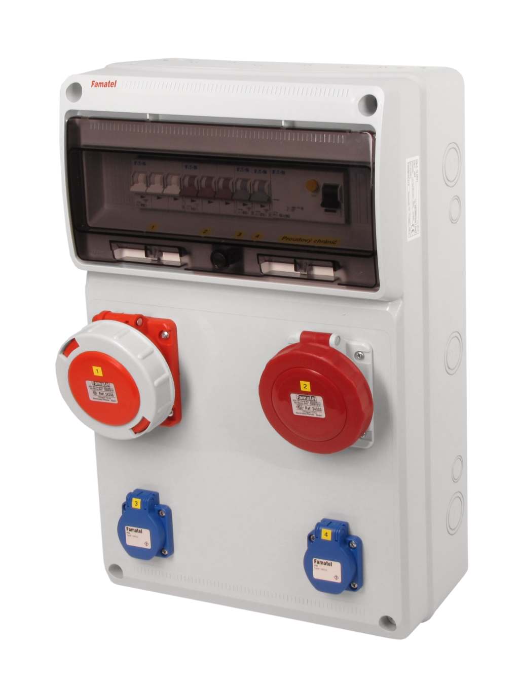 Zásuvková skříň FAMATEL v820 - ZSF20001010.0 /3952 IP54 jištěná bez chrániče, zásuvky 2x230V, 1x32/5, 1x63/5, přístroje EATON 10kA: 2xPL7-B16/1, 1xPL7-B32/3, 1xPL7-B63/3, použité pouzdro: 3952 - 500x330x155mm, barva: světle šedá.