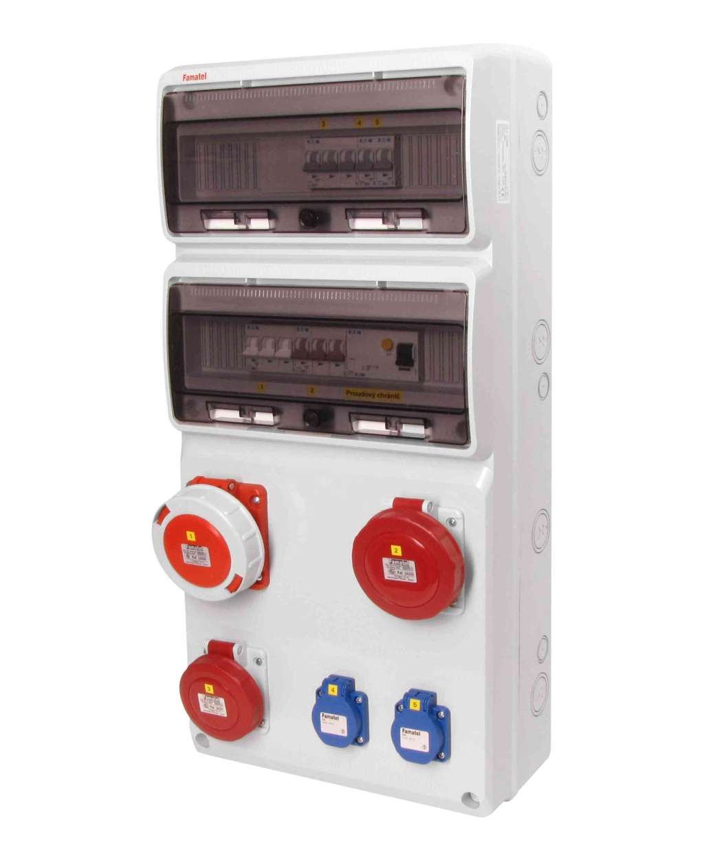 Zásuvková skříň FAMATEL v835 - ZSF20101010.1 /3977 IP54 jištěná s chráničem 63/4/003, zásuvky 2x230V, 1x16/5, 1x32/5, 1x63/5, přístroje EATON 10kA: 2xPL7-B16/1, 1xPL7-B16/3, 1xPL7-B32/3, 1xPL7-B50/3, PF7-63/4/003 na vstupu, použité pouzdro: 3977 - 685x330x155mm, barva: světle šedá.