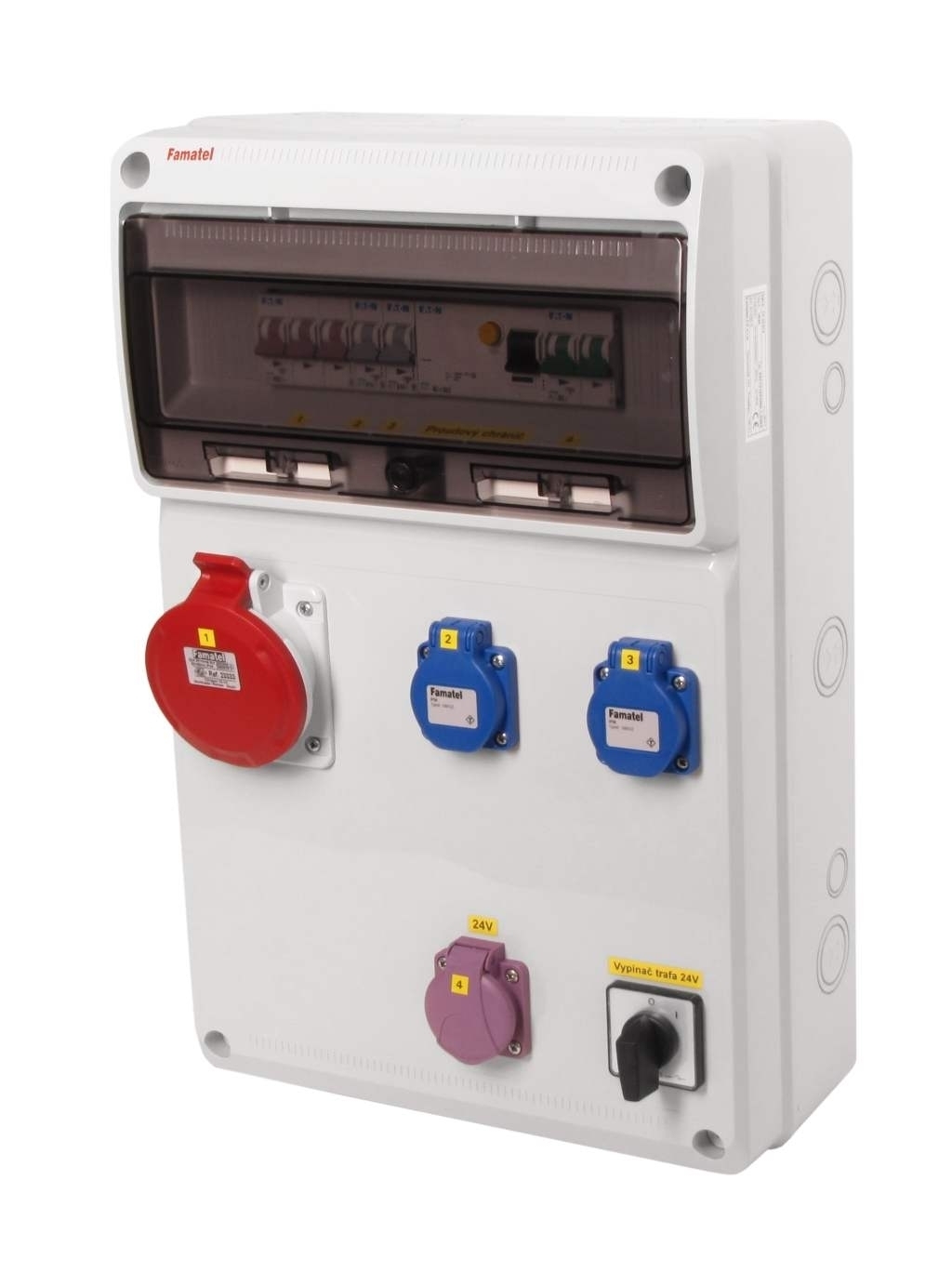 Zásuvková skříň FAMATEL v930 - ZSFT21001000.1 /3952 IP44 jištěná s chráničem 40/4/003, zásuvky 2x230V, 1x24V, 1x32/5, přístroje EATON 10kA: 2xPL7-B16/1, 1xPL7-B6/2, 1xPL7-B32/3, trafo 125VA, PF7-40/4/003 na vstupu, použité pouzdro: 3952 - 500x330x155mm, barva: světle šedá.