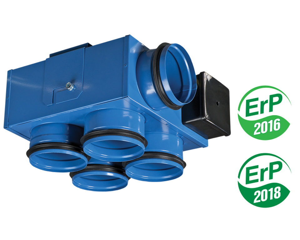 Ventilátor VENTS VKP 100/100x4 mini - potrubní, radiální, 1x vývod + 4x přívod, 3 rychlosti, 33;36;44dB, IPX4, modrý, 97;138;176m3/h.