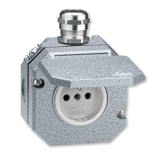 Zásuvka jednonásobná s víčkem a kovovou šroub. průchodkou, Al, IP55; šedá   Vhodné pro designy z vypínačových řad ABB : Garant   Objednací číslo : 5518-2760