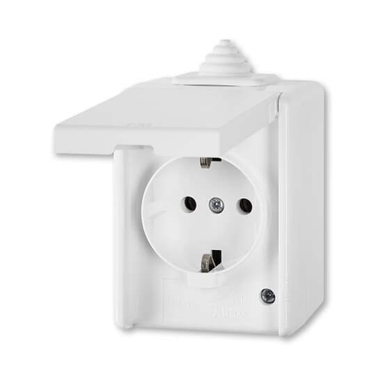 Zásuvka jednonásobná IP44, s ochr. kontakty (podle DIN), s víčkem; bílá   Vhodné pro designy z vypínačových řad ABB : Praktik   Objednací číslo : 5518-3929 B