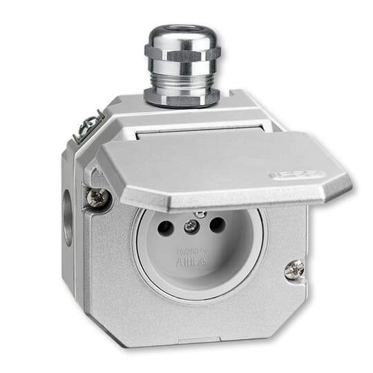 Zásuvka jednonásobná s víčkem a kovovou šroub. průchodkou, Al, IP55; stříbrná   Vhodné pro designy z vypínačových řad ABB : Garant   Objednací číslo : 5518-2760 39