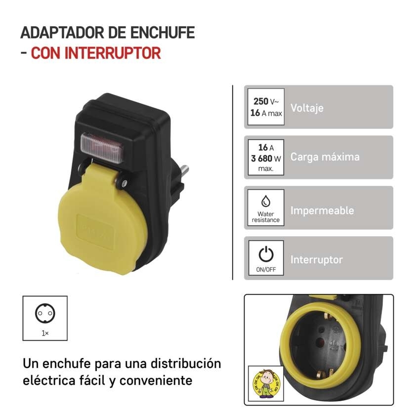 Rozbočovací SCHUKO zásuvka s vypínačem == barva: černá|dětské clonky: ano|krytí: IP44|materiál: plast|max. zátěž: 3 680 W|napětí/proud: 250 V~/16 A max.|počet pólů: neuvádí se|počet zásuvek: 1× 2P + PE|prodejní obal: 1 ks, závěs|produkt: zásuvka s vypínačem|typ: SCHUKO|vypínač: ano