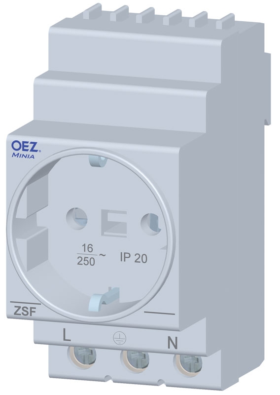 Soklová zásuvka ZSF-06 In 16 A, Ue AC 230 V, provedení „schuko“, přívod zespodu, přívod seshora, šířka 2,5 modulu OEZ:37293
