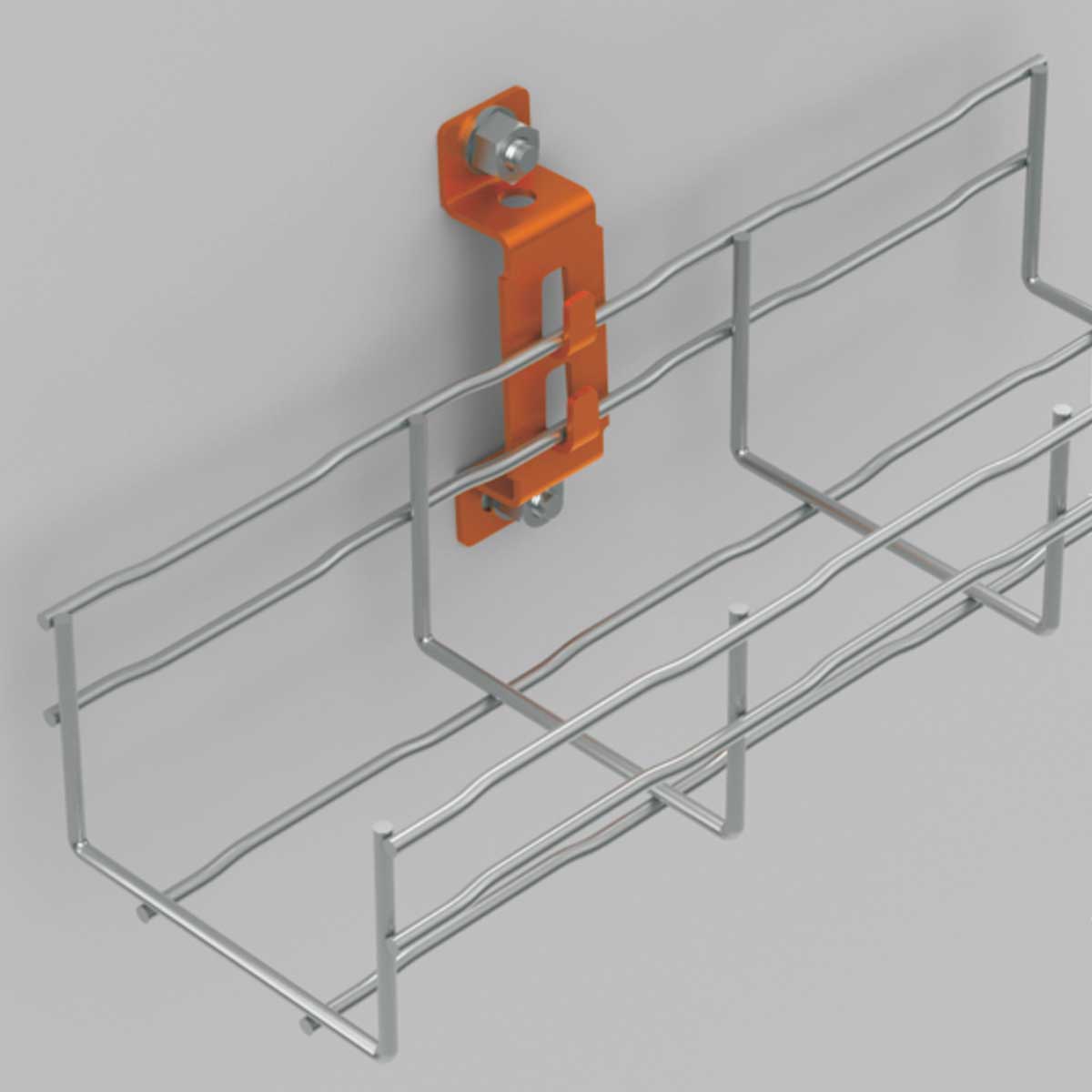 Závěs pro upevnění drátěného kabelového žlabu za bočnici ke stropu pomocí závitových tyčí nebo pro montáž na stěnu pomocí zavěšení na bočnici, povrchová úprava žárový zinek