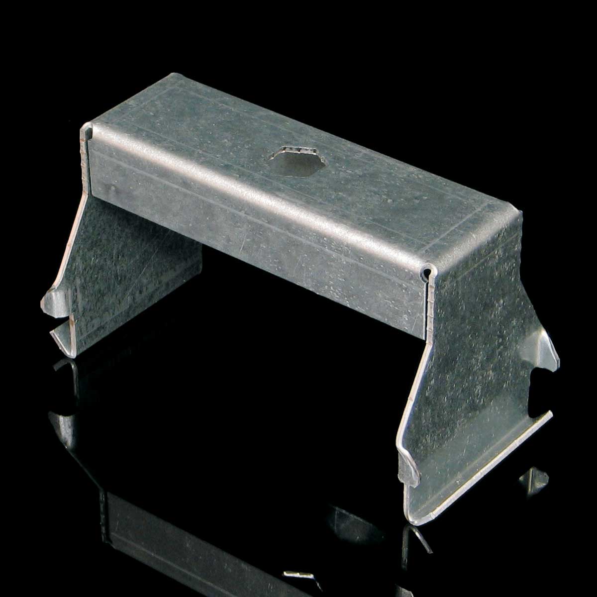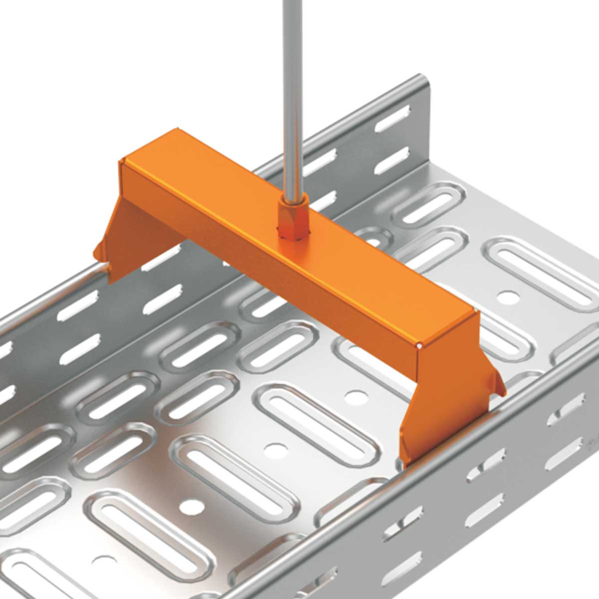 Závěs pro zavěšení kabelových tras pomocí jedné závitové tyče ze stropu, jednoduchá montáž zavěšením za lemy bočnic kabelových tras šíře 100 mm, vhodné pro kabelové trasy s povrchovou úpravou sendzimir
