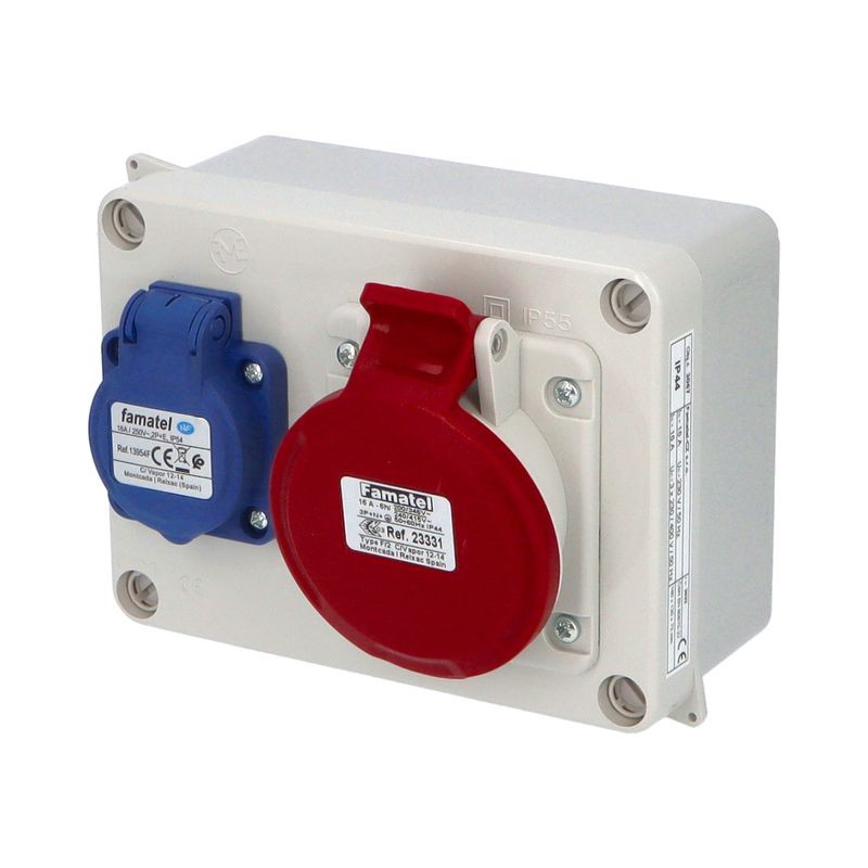 Krabice 3067 IP44 1x230V s ochr. kolíkem, 1x400V/16A/5, 160x120x73mm, hladké boky. Nachystáno na 3.fázové a 1.fázové připojení pomocí šroubových svorek (každý okruh 230/400V zvlášť).