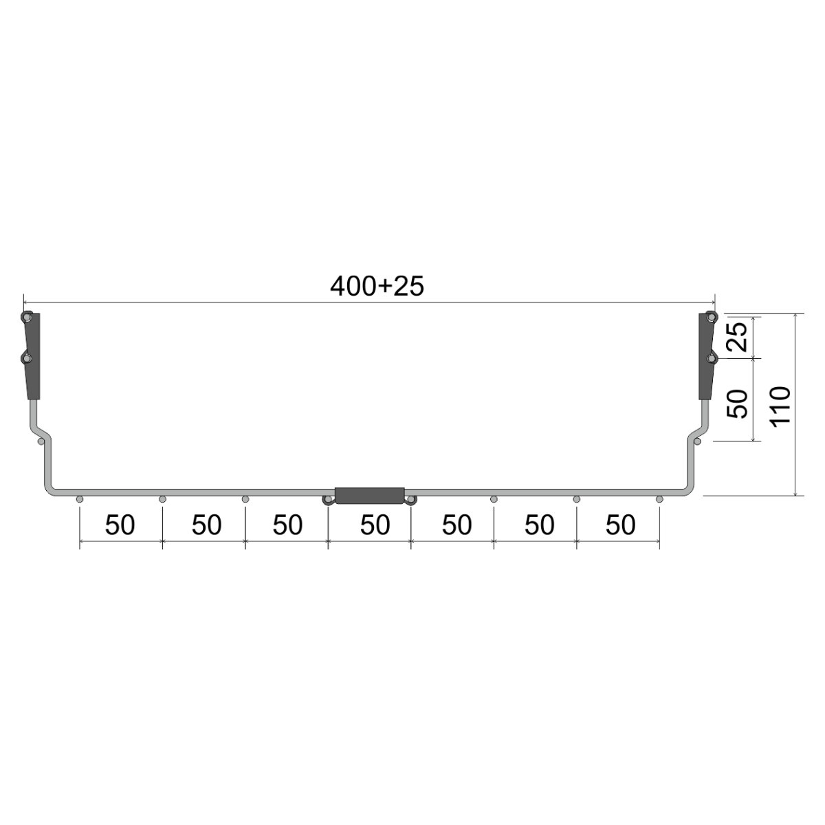 Drátěný žlab s integrovanou spojkou rozměru 110x400 v povrchové úpravě s vyšší ochranou proti korozi. Velikost sítě 100x50 mm. Profilované dráty zajišťují vyšší nosnost drátěných žlabů.