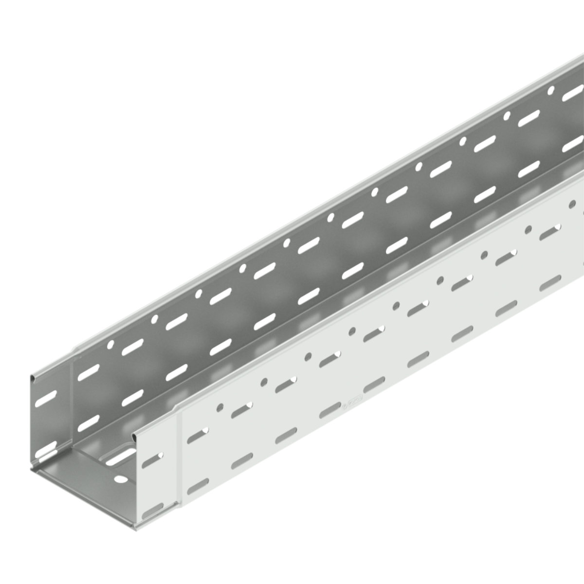 Kabelový žlab s integrovanou spojkou NKZI 100x125 z plechu tloušťky 1,25 mm v povrchové úpravě sendzimir, děrovaný, opatřený embosy pro zvýšení pevnosti a tuhosti.