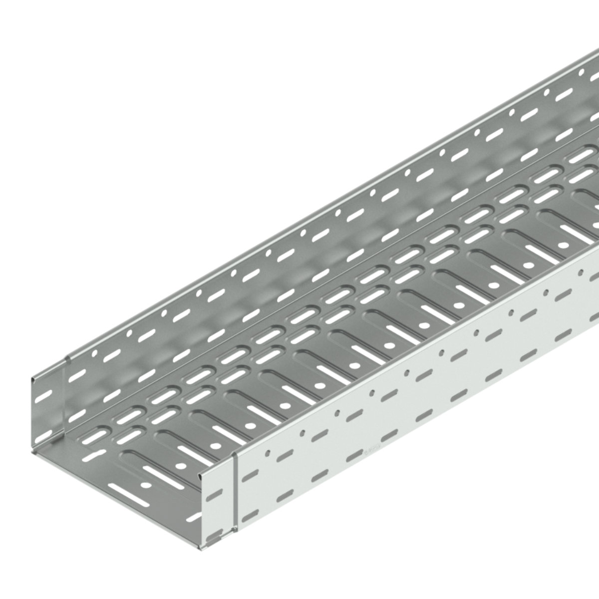 Kabelový žlab s integrovanou spojkou NKZI 100x250 z plechu tloušťky 0,70 mm v povrchové úpravě sendzimir, děrovaný, opatřený embosy pro zvýšení pevnosti a tuhosti.