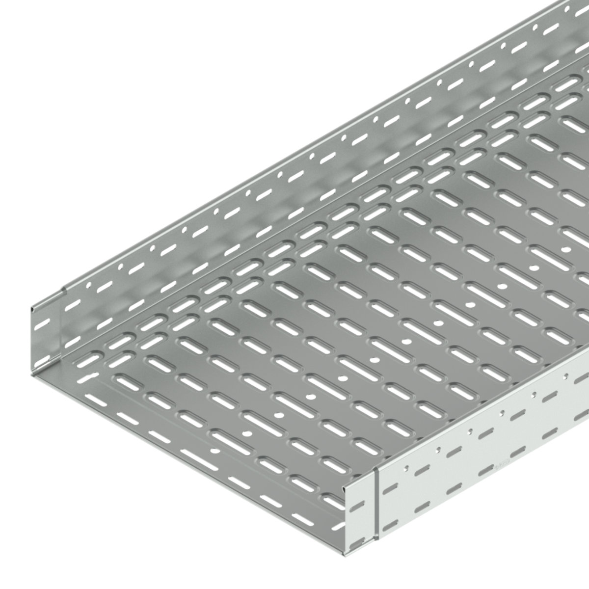 Kabelový žlab s integrovanou spojkou NKZI 100x500 z plechu tloušťky 1,0 mm v povrchové úpravě sendzimir, děrovaný, opatřený embosy pro zvýšení pevnosti a tuhosti.