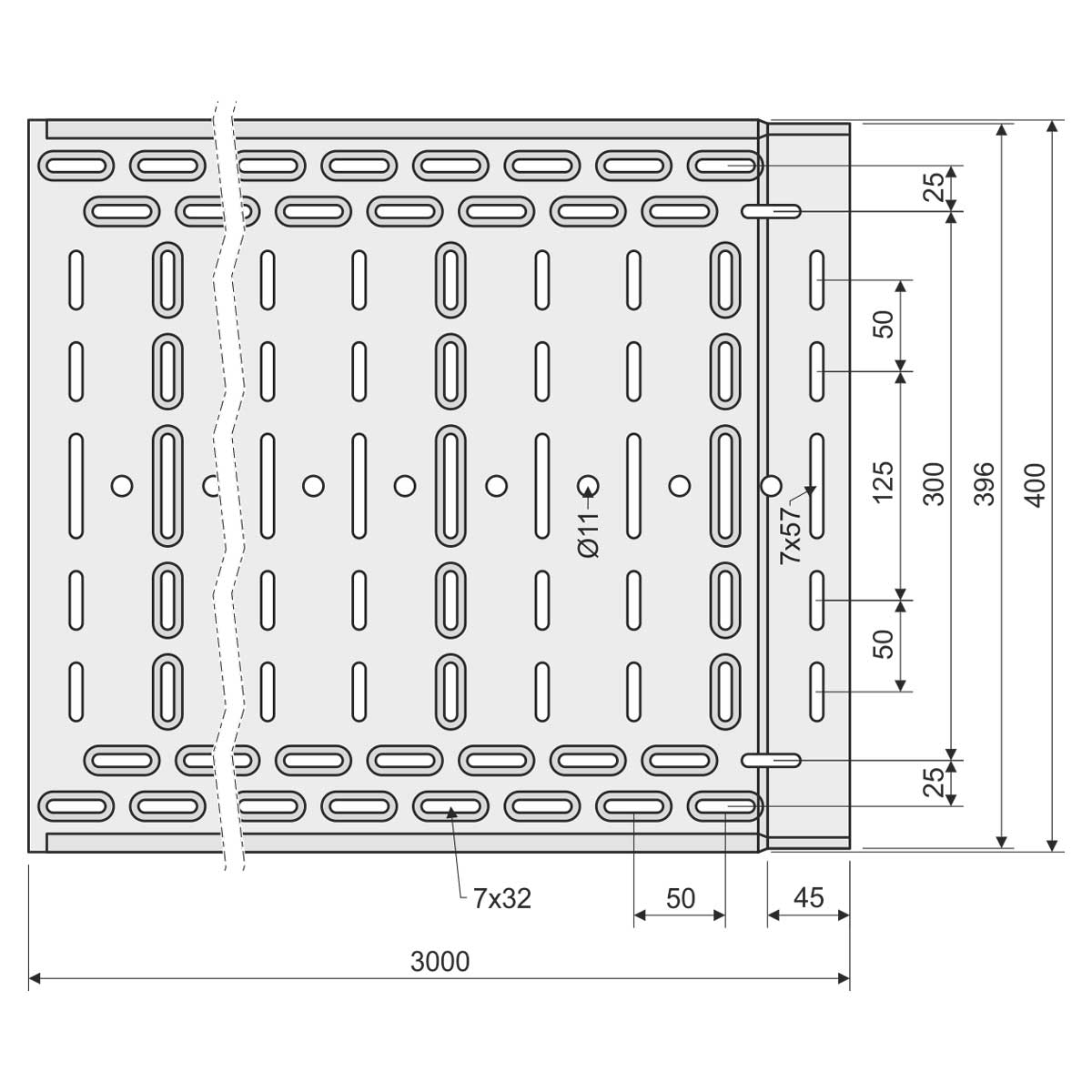 Kabelový žlab s integrovanou spojkou KZI 85x400 z plechu tloušťky 1,00 mm v povrchové úpravě sendzimir, děrovaný, opatřený embosy pro zvýšení pevnosti a tuhosti.
