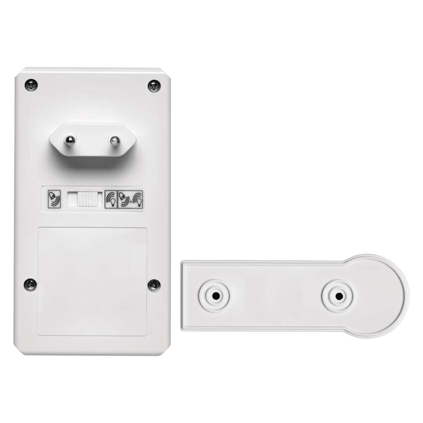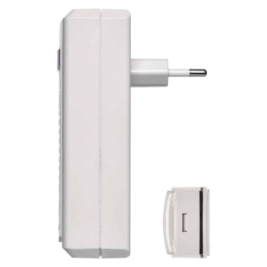 Domovní bezdrátový zvonek P5705 do zásuvky == barva: bílá|dosah tlačítka: 60 m|maximální hlasitost zvonění: 75 dB|možnost přidat další tlačítko: ano, max. 8|napájení hlavní jednotky: 230 V AC|napájení tlačítka: 1× 3 V CR2032 (součástí balení)|optická signalizace na tlačítku: ano|optická signalizace na zvonku: ano|počet melodií: 1|počet přijímačů v balení: 1 ks|počet tlačítek v balení: 1 ks|přenosová frekvence: 433 MHz|přídavné (náhradní) tlačítko: P5723T|prodejní obal: 1 ks, blistr|regulace hlasitosti: ne|rozměr tlačítka: 23 × 93 × 34 mm|rozměr zvonku: 73 × 65 × 120 mm|speciální funkce: ne|voděodolné tlačítko: IP44|způsob párování: automatické párování – self-learning|způsob přenosu: bezdrátový zvonek
