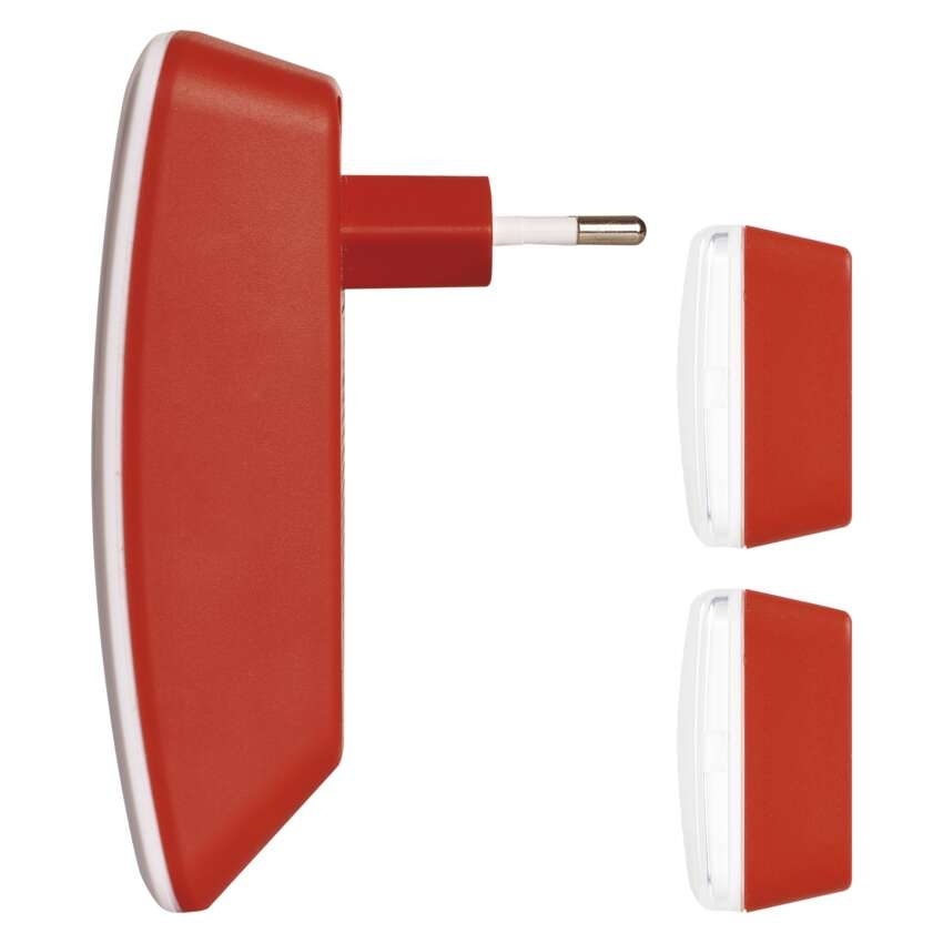 Bezbateriový domovní bezdrátový zvonek P5750.2T do zásuvky, se 2 tlačítky == barva: červená|dosah tlačítka: 150 m|maximální hlasitost zvonění: 110 dB|možnost přidat další tlačítko: ano, max. 8|napájení hlavní jednotky: 230 V AC|napájení tlačítka: bez napájení|optická signalizace na tlačítku: ano|optická signalizace na zvonku: ano|počet melodií: 10|počet přijímačů v balení: 1 ks|počet tlačítek v balení: 2 ks|přenosová frekvence: 433 MHz|přídavné (náhradní) tlačítko: P5750T|prodejní obal: 1 ks, blistr|regulace hlasitosti: ano, 5 úrovní|rozměr tlačítka: 24 × 90 × 40 mm|rozměr zvonku: 66 × 57 × 107 mm|speciální funkce: bezbateriové tlačítko|voděodolné tlačítko: IP44|způsob párování: automatické párování – self-learning|způsob přenosu: bezdrátový zvonek